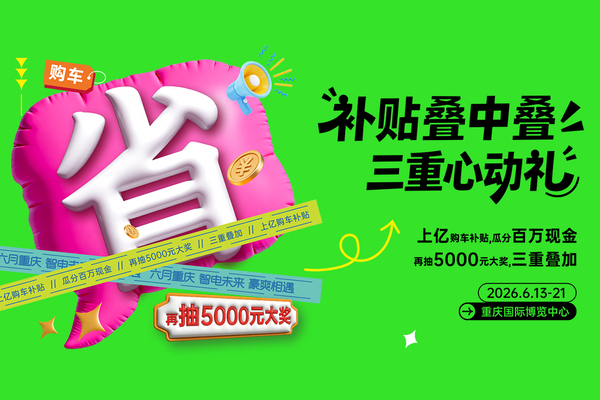 重庆年度最佳购车时机——置换更新补贴新能源车至高补1.5万元、燃油车至高补1.3万元;组委会百万补贴购车返现,每天100名,每车补1000元,覆盖整个展期;购车再抽5000元(税前)现金大奖;厂家大让利车展价到,尽享年中底价。